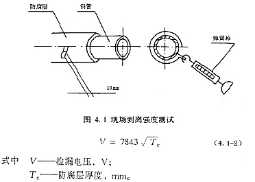 3)剥离强度:用刀环向划开10mm宽、长度大于100mm的胶带层,直至管体。 然后用弹簧秤与管壁成90°角拉开,如图4.1所示,拉开速度应不大于300mm/min。剥离强度应符合本资料要求达到:对有底漆的钢≥20,对背材(胶层与基材)5~10N。该测试应在缠好胶粘带24h以后进行。